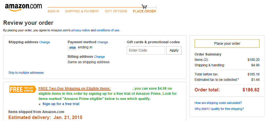 Below the “Create account” button and above the “Place your order” button were similar notices—both with hyperlinks in contrasting blue text—that told the Plaintiff that clicking the buttons not only created an account and placed an order, but also acknowledged Plaintiff’s acceptance of the Conditions of Use.