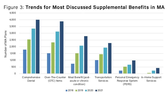 Figure 1 below shows that, across the board, the number of plans that offer the most popular supplemental benefits has increased every year since 2018.