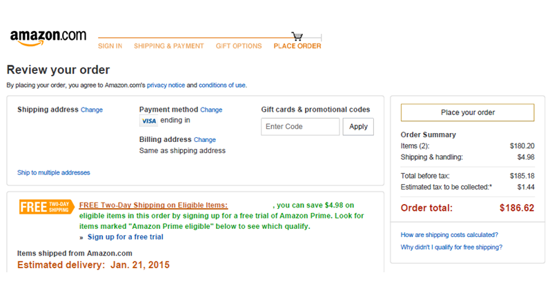Below the “Create account” button and above the “Place your order” button were similar notices—both with hyperlinks in contrasting blue text—that told the Plaintiff that clicking the buttons not only created an account and placed an order, but also acknowledged Plaintiff’s acceptance of the Conditions of Use.