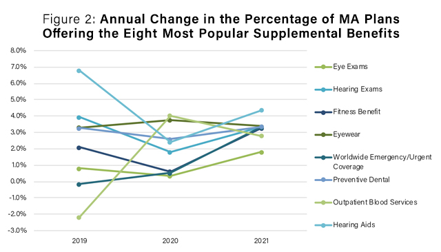 Figure 2 below analyzes the annual change in the percentage of MA plans offering the top eight supplemental benefits compared to total plans offered. We saw a decrease in outpatient blood services, a benefit that is difficult to market, as plans increase more marketable supplemental benefits. All other popular benefits are increasing in frequency. The percentage of total plans offering hearing aids, for example, as a supplemental benefit was the largest increase.
